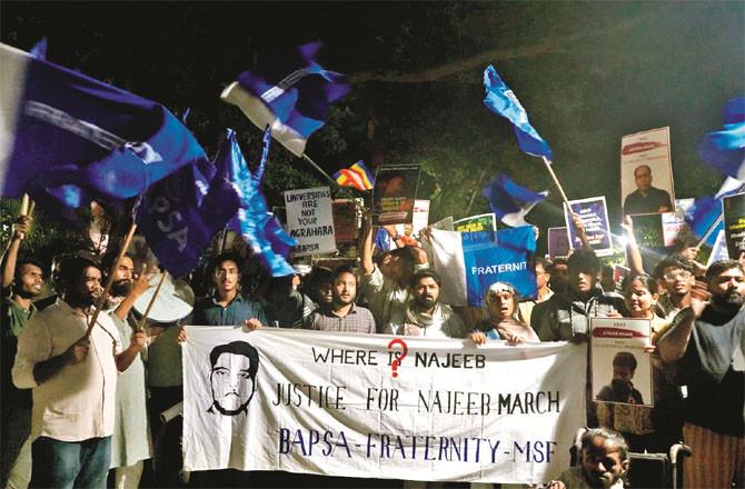 جواہر لال نہرو یونیورسٹی (جے این یو) کے طالب علم نجیب احمد کی پراسرار گمشدگی کو ۹؍سال گزرگئے ہیں لیکن اب تک پولیس اور انتظامیہ اسے ڈھونڈ نہیں پائے ہیں۔۱۵؍ اکتوبر کواس جبری گمشدگی کو نو سال مکمل ہو نے پر طلبہ نے احتجاج کیا اوور ایک بار پھر کیمپس انصاف کے نعروں سے گونج اٹھا۔ ’مکتوب میڈیا‘کی تفصیلی رپورٹ کے مطابق منگل کی رات برسا امبیڈکر پھلے اسٹوڈنٹس ایسوسی ایشن(باپسا)، فرٹرنٹی موومنٹ، اور مسلم اسٹوڈنٹس فیڈریشن (ایم ایس ایف) کے اراکین نے’’ نجیب کو انصاف دو‘‘ کے نعرے کیساتھ زبردست احتجاجی مارچ کیا۔ مظاہرین نے جوابدہی کا مطالبہ کرتے ہوئے وہ سوال بلند کیا جو گزشتہ نو برسوں سے گونج رہا ہے:’’نجيب کہاں ہے؟‘‘